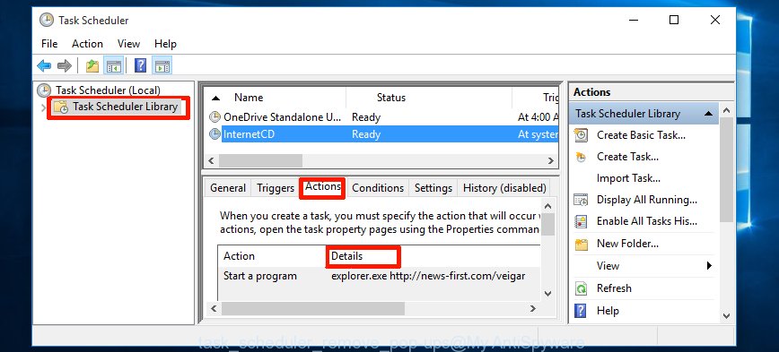 In the middle part you will see a list of installed tasks. Select the first task, its properties will be display just below automatically. Next, click the Actions tab. Necessary to look at the text which is written under Details. Found something such as “explorer.exe http://site.address” or “chrome.exe http://site.address” or “firefox.exe http://site.address”, then you need get rid of this task. If you are not sure that executes the task, then google it. If it is a component of the adware, then this task also should be removed.