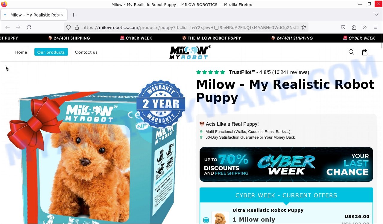 The Milow Robot Puppy is marketed as a realistic, handcrafted, interactive puppy toy, but in reality, it’s a low-quality, cheaply made product that fails to perform as advertised. It uses aggressive discount tactics and showcases customer reviews that appear fake and misleading.